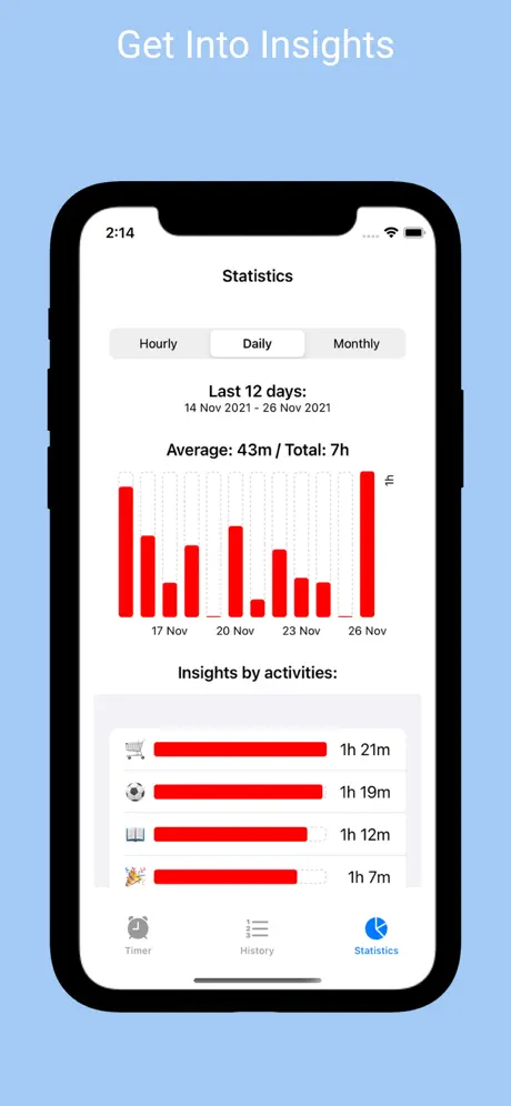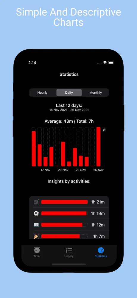 Track your activities, manage your time, and get insights about how you spend it. A minimal, distraction-free iOS app for Pomodoro and time tracking — no paid tiers, no gimmicks.